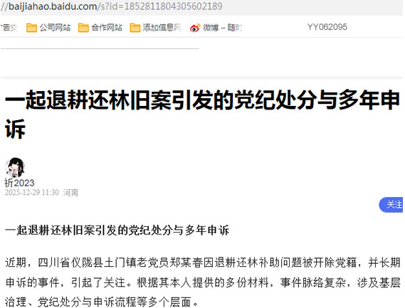 近期,四川省仪陇县土门镇老党员郑某春因退耕还林补助问题被开除党籍,并长期申诉的事件,引起了关注。根据其本人提供的多份材料,事件脉络复杂,涉及基层治理、党纪处分与申诉流程等多个层面。