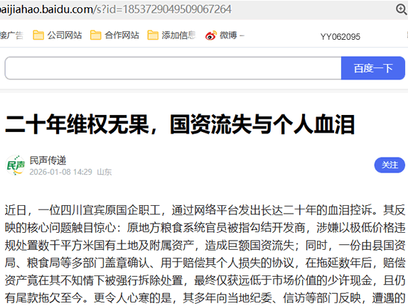 近日,一位四川宜宾原国企职工,通过网络平台发出长达二十年的血泪控诉。其反映的核心问题触目惊心:原地方粮食系统官员被指勾结开发商,涉嫌以极低价格违规处置数千平方米国有土地及附属资产,造成巨额国资流失;同时,一份由县国资局、粮食局等多部门盖章确认、用于赔偿其个人损失的协议,在拖延数年后,赔偿资产竟在其不知情下被强行拆除处置,最终仅获远低于市场价值的少许现金,且仍有尾款拖欠至今。更令人心寒的是,其多年向当地纪委、信访等部门反映,遭遇的却是“踢皮球”、“换人重谈”、“避重就轻”式的敷衍。