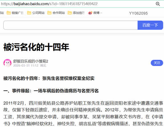 2011年2月,四川省美姑县公路养护站职工张先生在返回资阳老家途中遭遇交通事故,仅留下轻微后遗症,并未确诊任何精神类疾病。2012年,为帮张先生申请病员工资,其亲属代为提交申请,却被同事李某、吴某平刻意篡改文书内容,在《申请书》中捏造“脑神经软化灶、神经失控、胡言乱语”等虚假病情描述,甚至伪造张先生签名,将其污名为“精神病患者”。
