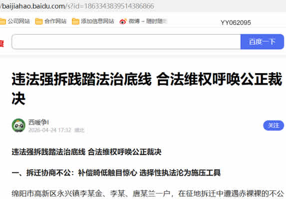 直至一个月后当事人准备提起诉讼,永兴镇Z府才被迫承认强拆行为,敷衍通知领取财物。这种 “先暴力强拆、后被迫认账,不告绝不处理” 的流氓做法,是对公民合法财产权的公然践踏,与绵阳全国文明城市的称号彻底相悖,严重突破法治底线,漠视公民基本人权。